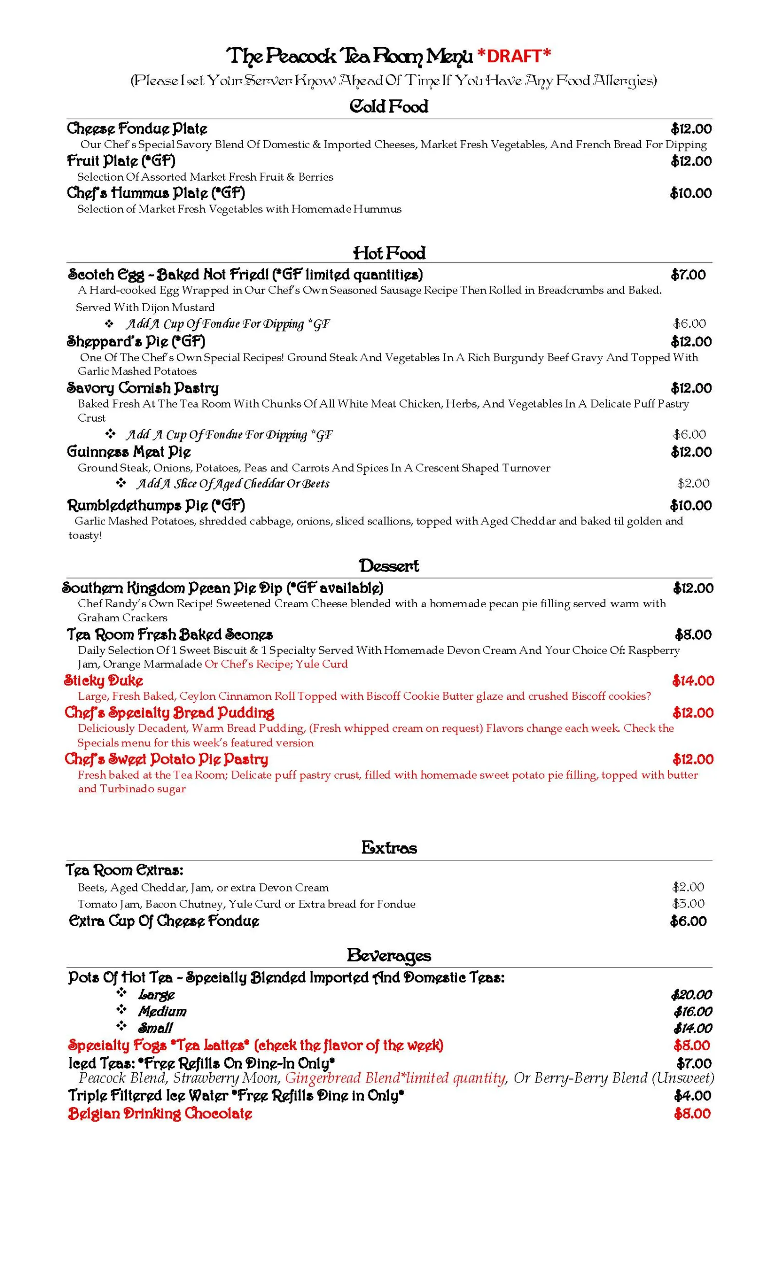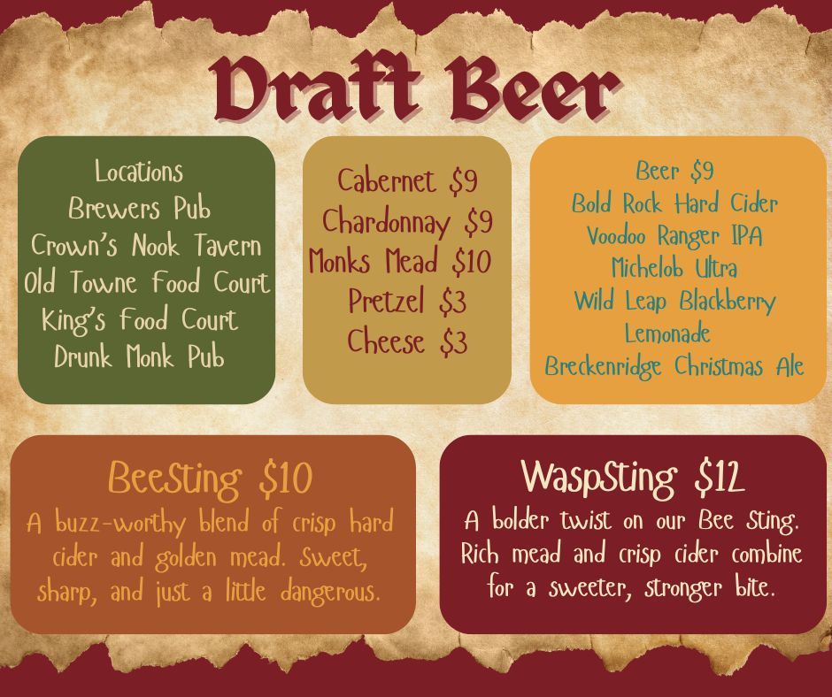 A complete selection of beer, wine and mead. Water, soda, and pretzels also.